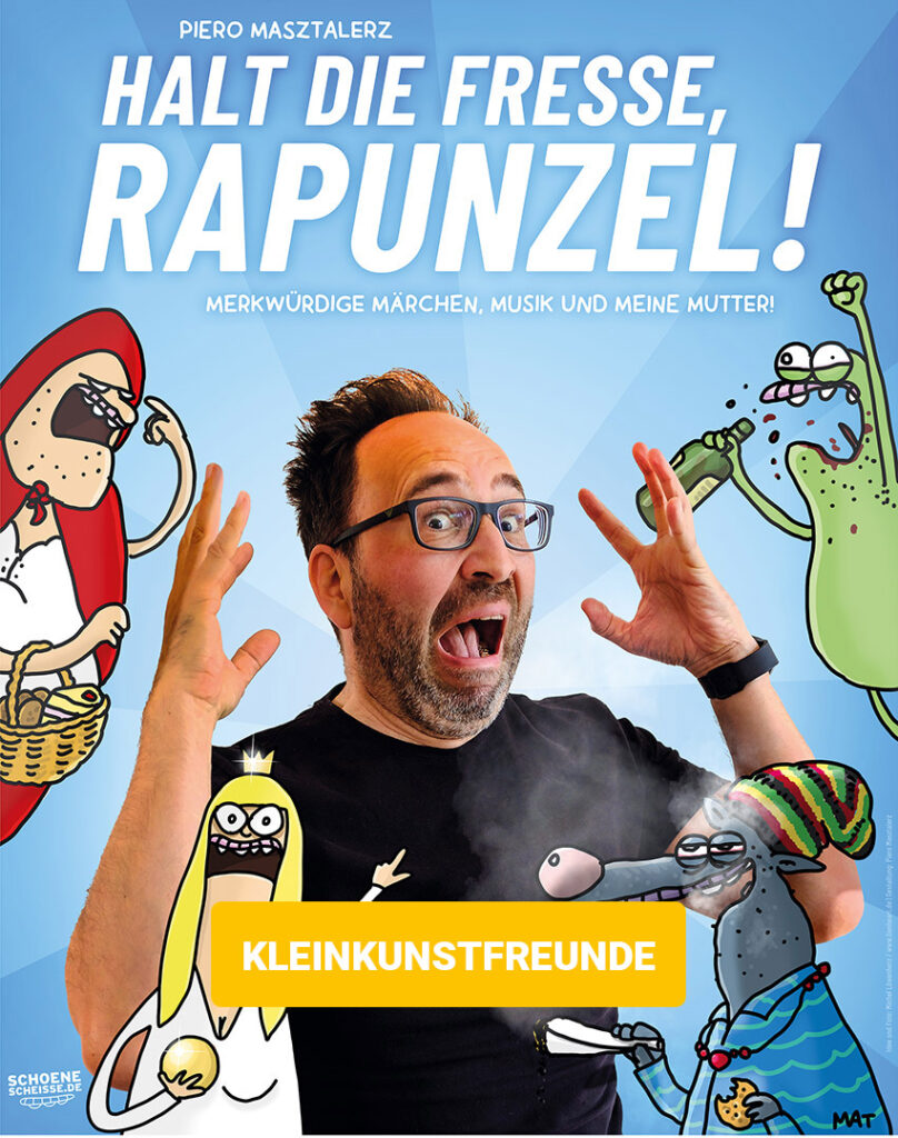 Auch in „Halt die Fresse, Rapunzel!“ kommen Pieros skurrile Märchenfiguren zu Wort, und das sogar öfter als dem Entertainer lieb ist. Die schrägen Charaktere grätschen ihm auf humorvolle Weise immer wieder in seine Geschichten und stellen ihn vor einige Herausforderungen, denn die Märchenfiguren aus dem Masztalerz-Universum sind von einer disneyhaften Leichtigkeit so weit entfernt wie Olaf Scholz von einer lockeren Tanzeinlage auf Tik Tok.